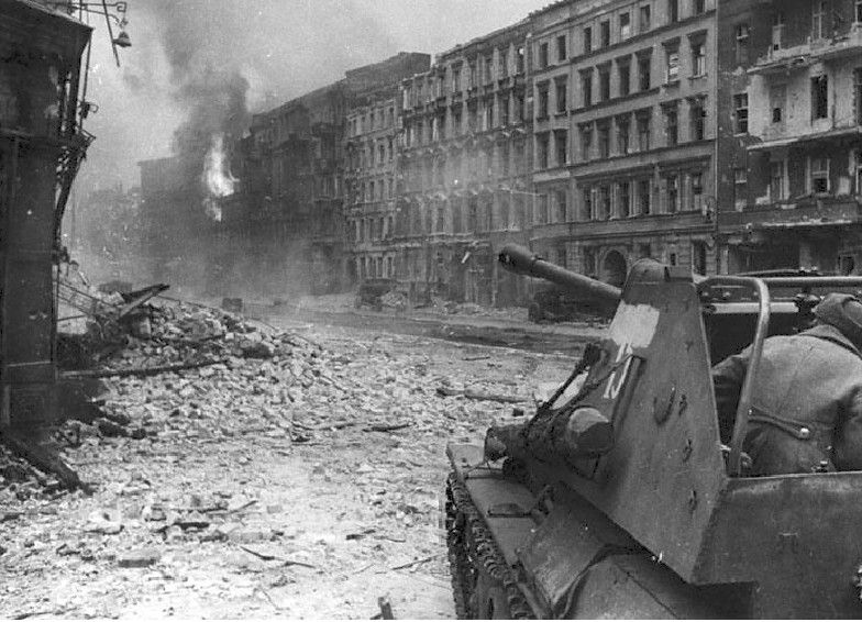 攻入柏林的苏军SU-76型自行火炮正在炮击德军据守的建筑物战局已经发展到这种程度,希特勒还不忘派遣了一支秘密警察部队,让他们在施特劳斯贝格地区抓捕和处决逃兵,任何没得到命令就进行撤退的士兵也要一律枪毙。最可笑的是,这些被派往前线防止士兵逃跑的人,有很多在半路就没影了。当时,有大约4万名逃兵藏在柏林城内。尽管此时苏军还没有发起进攻,但逃兵就已经大量出现了。希特勒的秘密警察和盖世太保已经完全失去了作用。