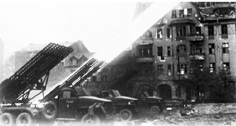 1945年4月,柏林,正在发射的苏军BM-13“喀秋莎”132毫米火箭炮,火箭炮运载车为美国援助的斯图贝特型卡车。4月23日下午,苏军第5突击集团军、第1近卫坦克集团军和第8近卫集团军从柏林的东部和东南部进行攻击,这是魏德林所要面对的最大威胁。当天晚上,一批完好的德军装甲战斗车辆返回腾珀尔霍夫机场加油。一切都准备妥当之后,它们前往东南方向对布里茨发起反攻。负责支援他们的是几辆“虎”式重型坦克和一些迫击炮。然而,绝大多数德军士兵手中能用来对抗苏军坦克的,就只有反坦克火箭筒或反坦克手雷了。