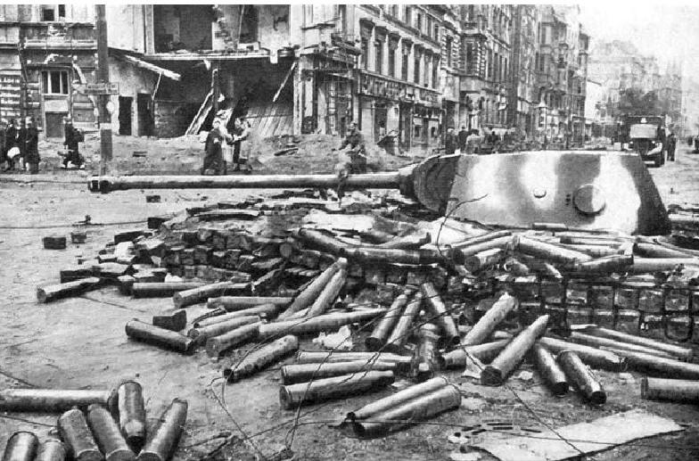 德军设置在柏林街头的“豹”式坦克炮塔堡垒,炮塔下有砖石或圆木修建的地下工事,可储存弹药或安置人员。在柏林城西北部,作为苏联第2坦克集团军的工兵军官,谢别列夫上校向家中写的信充分说明了现在柏林的局势:“写这封信的时候,我正在柏林的一座高大建筑内,同几个军官一起发布上级的命令,传令兵和信号兵不停地在我眼前穿梭。士兵们冲进一个又一个建筑,他们小心地前行,而我们也即将攻入柏林的中心区域。一些负隅顽抗的德国守军从门和窗户后面向我们的坦克发起攻击,可是我们的坦克兵非常有办法,他们避开了街道中心,而是沿着旁边的人行道行进,然后冲着街道对面,用榴弹炮和机枪开火,而另一侧人行道上的坦克同样也向相反的方向射击。这样一来,躲在门和窗户后面的德国人只能拼命逃跑,死伤惨重。与此同时,在一座很大的院落里,我们的后勤兵在补给车上给饥饿的德国市民分发食物。由于饥饿和战火的摧残,他们看起来是那么窘迫、绝望与无助。曾经美丽的城市,现在到处都是障碍物和被毁坏的车辆。所有的房子都是空的,而那些活着的人基本上都躲到地下室去了。现在正是家乡收获谷物的时候,我们真希望早点儿回去与你们见面,战争马上就要结束了,我们非常高兴。”