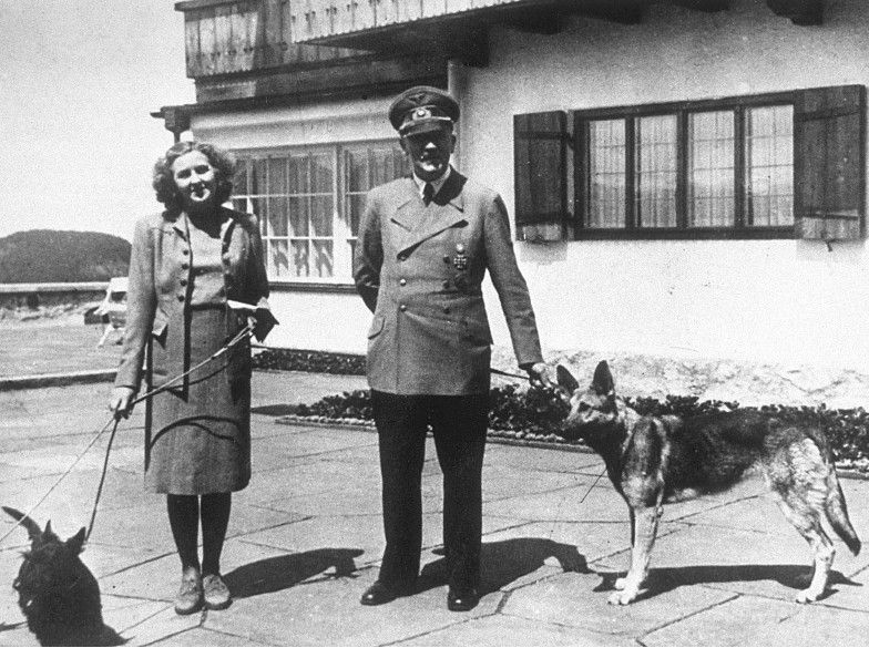 希特勒与情妇爱娃牵着他们的爱犬,这张照片是美军第101空降师在贝希特斯加登缴获的照片之一。希特勒生前有大量与爱犬玩耍的照片,但是出于在世人面前维持威严形象的需要,希特勒不允许公布这些照片。4月26日希特勒照例召开临时会议,可他突然发现费格莱因不在会场。鲍曼曾与费格莱因洗过桑拿,知道后者在夏洛滕贝格有间公寓。希特勒马上派出一队盖世太保去了那间公寓。很显然,费格莱因同情人在一起,但是他已经喝醉了,旁边放着装满钱、珠宝和假护照的行囊,看样子早已收拾妥当准备逃跑了。被捕获的费格莱因坚持要给爱娃打电话,这让爱娃非常震惊,没想到他也准备离开自己敬爱的元首。爱娃非常伤心,并拒绝干预此事。可费格莱因称格雷特(爱娃的妹妹)要生孩子了,他必须去陪她。爱娃再也不会相信他了,最后费格莱因被秘密押解回来,关在帝国总理府地下室的一个房间内。