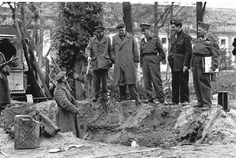 拍摄于战后的照片,几个盟军军官站在一个土坑前,据说希特勒的尸体就是在这个坑中进行焚烧的。当元首的尸体还在花园里燃烧的时候,地下避弹所内所有的人都开始觉得自己不会被苏联红军杀死,有些人则开始酗酒。此时的鲍曼却把心思放在了新一届德国政府的组建上。他首先向邓尼茨发了一封电报,而现在的邓尼茨正在基尔附近的普伦指挥所里。电报告知邓尼茨,他将接任德国元首一职,应该根据战局的形势,立即采取相应的措施。鲍曼并没有告诉他希特勒已经死了,如果没有希特勒,邓尼茨将没有任何权力可言。可是让鲍曼没想到的是,希姆莱同邓尼茨在一起,邓尼茨没有拘捕他,而鲍曼必须加入新一届的纳粹政府,这样他才能同希姆莱对抗。但此前,戈培尔、克莱勃斯和布格多夫都决定留在柏林一起自杀。