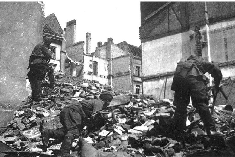 苏军白俄罗斯第1方面军的步兵手持PPS-43型7.62毫米冲锋枪与德军展开巷战与此同时,柏林城内的苏军仍然利用重型火炮对国会大厦进行攻击。所有的军官都希望自己的士兵能够第一个冲进国会大厦,将第3突击集团军的红旗插在国会大厦上,因为这将使自己永载苏联的史册。