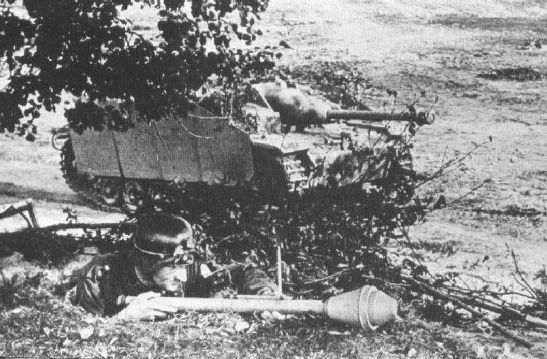 装备“铁拳”式反坦克火箭筒的德军人民冲锋队士兵和PzIII型突击炮。突击炮的外形低矮,非常适合防御,德军中较为流行的说法是,在防御战中1个突击炮旅的战斗力相当于1个装甲师。在突围中,最难以通过的地点就是车站北部。在那里,他们必须越过施普雷河。然而,周围燃烧的建筑物发出的火光照亮了整个区域。蒙克和希特勒的秘书们很聪明地绕开了威丁桥,转而走了下游的一座金属人行桥,向慈善医院方向前进。突围的部队由党卫军的“虎”式重型坦克和突击炮开路,作为先头部队,他们承担着主要的突围任务。这次突围的消息早已被传开,有成百上千的党卫军、国防军士兵和平民加入到这支庞大的队伍。