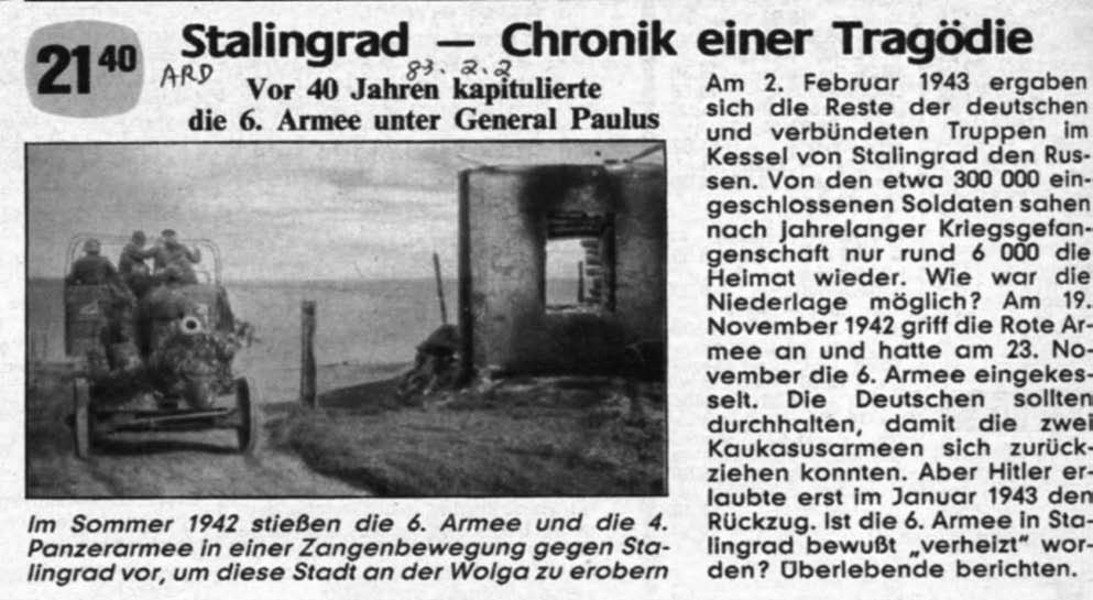 在斯大林格勒战役结束整整40周年的1983年2月1日和2月2日,德国电视二台和电视一台,分别播出了“斯大林格勒——40年后”(Stalingrad-40 Jahre danach)和“斯大林格勒——一个悲剧的纪年”(Stalingrad-Chronik einer Tragödie),各有说明:“第6集团军士兵回忆那悲惨的包围战”和“40年前保卢斯将军指挥的第6集团军投降了。”