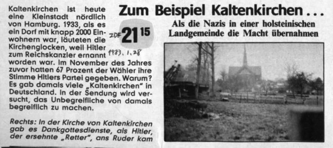 1月28日,电视二台又播出一个题为《以卡腾基辛为例……当纳粹攫取霍尔斯泰因一个村镇的权利时》(Zum Beispiel Kaltenkirchen......als die Nazis in einer hosteinischen Landgemainde die Macht übernahmen.)的节目。位于汉堡以北的卡腾基辛现在已经发展成一个小城市,但1933年它还是一个只有约2000人的村庄。希特勒被兴登堡总统任命为帝国总理的消息传来时,村里教堂钟声大作,以示庆贺,因为前一年11月村子里67%的选民把选票投给了他所领导的纳粹党。为什么会有那么多选民选择希特勒?像卡腾基辛那样的村镇在当时的德国绝非少数,这值得人们深思。