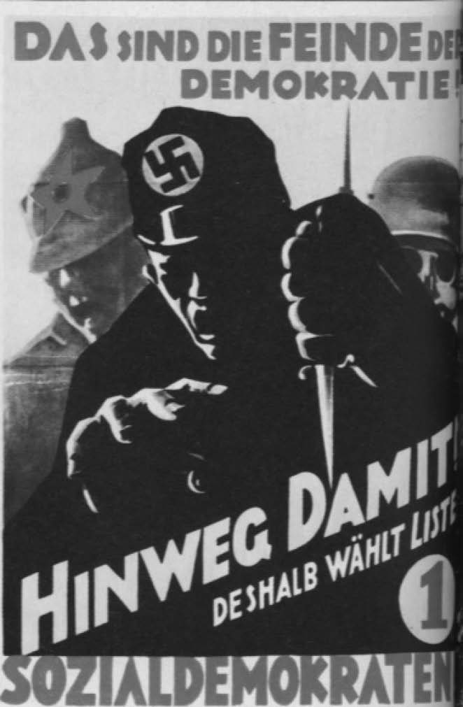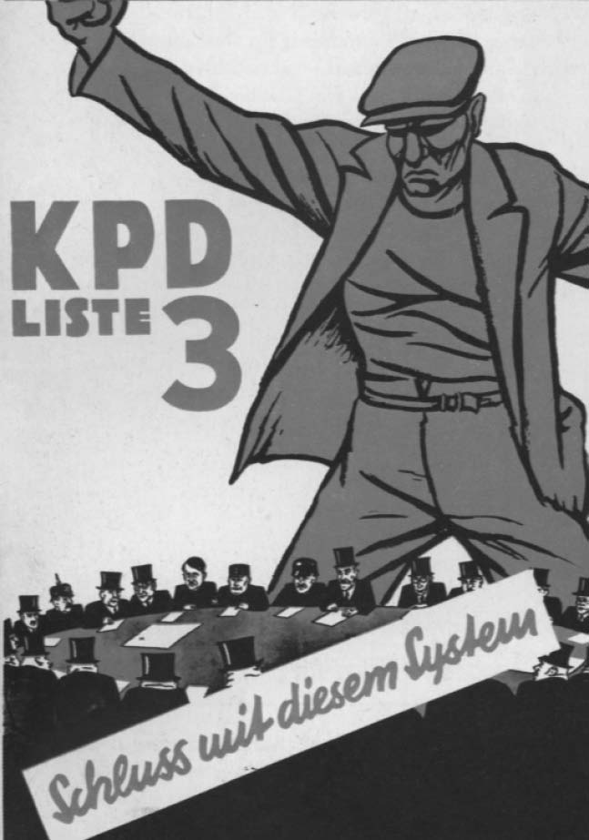 在德国中学历史教科书上,有1930—1932年间德国几个主要政党的竞选招贴画。在共产党的竞选招贴画上,有一群“绅士”围坐在会议桌旁议论国是,一个工人扬起手臂,下面是竞选口号:“结束这样的制度”。社会民主党的招贴画中,左翼的共产党和极右翼的纳粹党都成为“民主的敌人”。纳粹党的招贴画上则是一群面容憔悴、神情失望的人,文字很简单:“我们最后的希望:希特勒”。