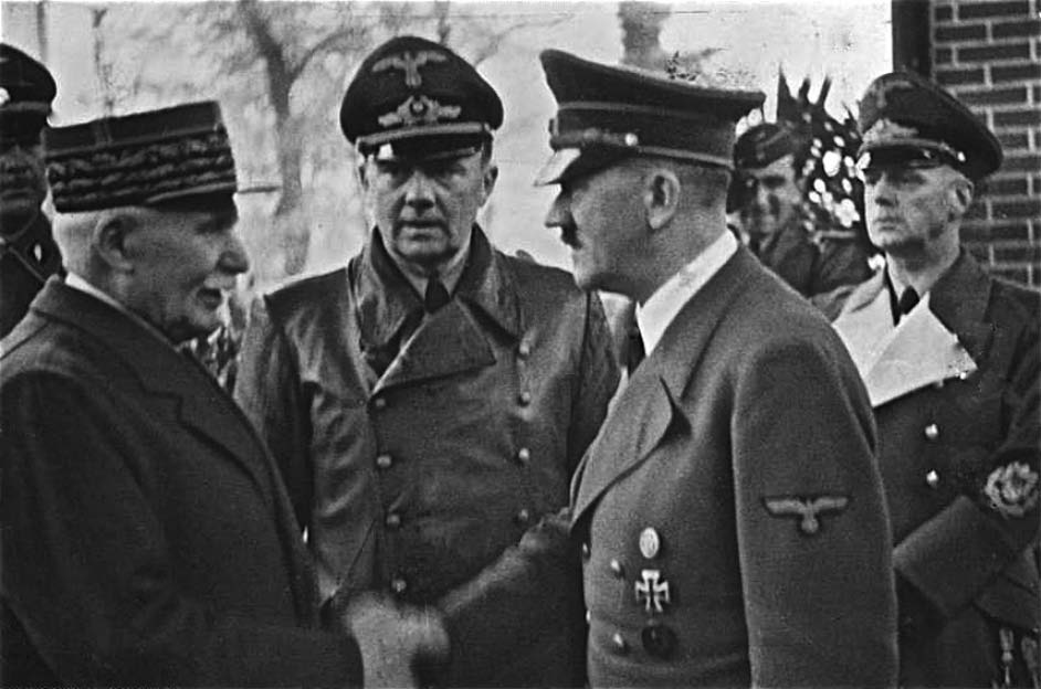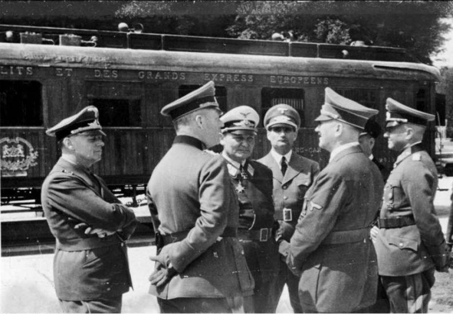法国战役期间,希特勒一直乘专列在离前线不远的地方就近指挥,战事结束后在比利时和法国观看了第一次世界大战旧战场,在巴黎逗留几个小时,到了著名的凯旋门,还到巴黎北郊贡比涅森林,走进那节第一次世界大战德军签署投降协定的车厢,在当年受降者、法国元帅斐迪南·福煦(Ferdinand Foch,1851—1929)坐过的椅子上坐了一会儿。归程专门到法德边界观看了法国下大力气修筑的举世闻名的马其诺防线。