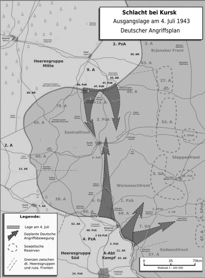 按照曼施坦因制订的计划,“堡垒行动”由德军两个集群实施。北翼克鲁格元帅指挥的中央集群向南进攻,担任主攻任务的是莫德尔将军指挥的第9集团军。一说它由22个师组成,其中有7个坦克师、1个坦克掷弹兵师(Panzergrenadierdivision,一种由步兵和坦克配合作战的部队),另一资料则说由21个德国师、3个匈牙利师组成,共33.5万人。协助它的是瓦尔特-奧托·怀斯(Walter-Otto Weiß,1890—1967)上将指挥的第2集团军,由7个步兵师和2个坦克师组成,9.7万人。南翼曼施坦因自己指挥的南集群向北进攻,担任主攻任务的是霍特将军指挥的第4坦克集团军。一说该集团军由19个师组成,其中9个是坦克师或坦克掷弹兵师,另有瓦尔特·内林将军(Waltber Nehring,1892—1983)指挥的第24坦克军(由1个坦克师和1个装甲掷弹兵师组成)作为预备队,总数21个师。另一资料则说它由第52步兵军、第48装甲军和第2党卫队装甲军组成,共22.4万人。此外还有一个由维尔纳·肯普夫将军(Werner Kempf,1886—1964)指挥的“肯普夫集团”(Army Detachment Kempf),10个师,12.6万人,向东北方向进攻,阻击苏联沃罗涅日方面军后方援军。