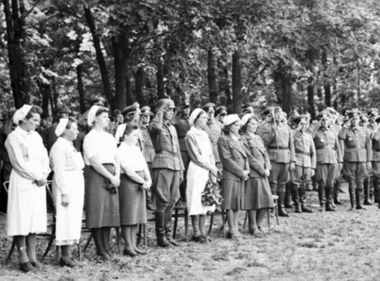 在哈尔科夫举行的胡讷斯多夬告别仪式,前排左起第六人(着护士服、手持花环者)是他的妻子,右起第五人(手持元帅权杖者)是曼施坦因,第四人是霤特。