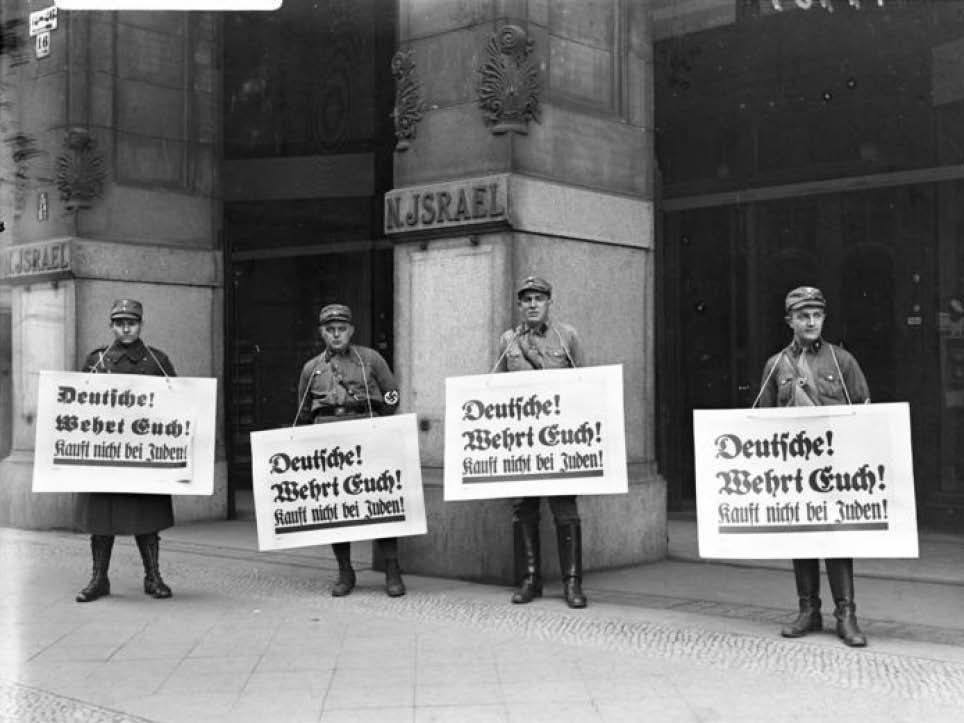 1933年4月1日,纳粹“冲锋队”在柏林号召抵制犹太人商店,举着的标语牌上写着:“德意志人!保卫自己!别向犹太人买东西。”(Deutsche!Wehrt Euch!Kauft nicht bei Juden!)