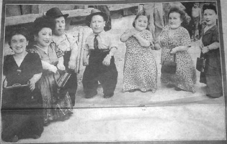 当年那位苏联红军女军医曾经奇怪,为什么幸运活下来的孩子绝大多数都是双胞胎,不久答案就知道了。原来,“二战”期间德国和日本都在进行惨无人道的人体实验,而“死亡天使”门格勒最感兴趣的便是一些特殊群体,尤其是双胞胎和侏儒。被他做过“实验”的双胞胎约有3,000对,大多数都在试验中死去。侥幸没死的,试验结束也立即被送进毒气室。活到苏联红军解放奥斯威辛那一天的,实在是少而又少。奇特的是幸存者中竟有11人是同一家人:两位母亲和她们的9个孩子。这一家是罗马尼亚犹太人,姓奥维茨,父亲西姆森·奥维茨(Shimson Eizik Ovitz,1868—1923),身高正常,先后娶的两位妻子也都是正常人。但第一位妻子所生两个孩子都是侏儒,第二位妻子生了八个孩子,其中五个是侏儒。西姆森1923年去世,最大的孩子罗兹卡已经37岁,最小的妹妹皮尔拉才两岁,三个身高正常的孩子分别为16岁、12岁和6岁。两位母亲带着10个孩子走江湖卖艺。他们能歌善舞,多才多艺,而且能用罗马尼亚语、匈牙利语、俄语、德语以及中东欧地区犹太人通用的意第绪语(Yiddish)等多种语言演出,颇受欢迎。这个家庭戏班起名“小人国戏班”(Lilliput Troupe),得自英国作家乔纳森·斯威夫特的名著《格列佛游记》(Gulliver's Travels)里“小人国”的名字“Lilliput”。