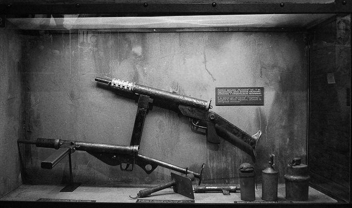 华沙起义“家乡军”自己制造的“Błyskawica”冲锋枪(上)和“Sten”冲锋枪(下)以及其他自制武器(华沙起义纪念馆陈列)