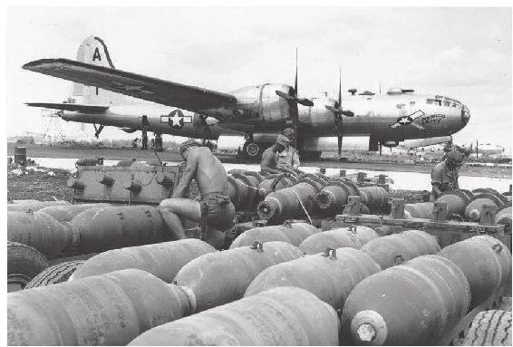 正在等待装弹的B-29轰炸机。B-29不仅是二战时各国空军中最大型的飞机,同时也是当时集各种新科技的最先进武器之一。它可以在万米高空进行高速飞行,当时轴心国的大部分战斗机都很难爬升至这种高度,就算勉强能爬上去,也追不上B-29的速度