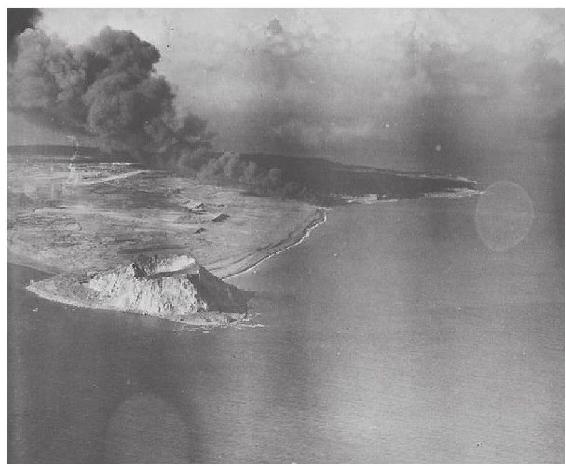 从空中鸟瞰硫黄岛,可以看到岛上火山喷发形成的滚滚浓烟,它的下面已经被日军改造成了另一个世界