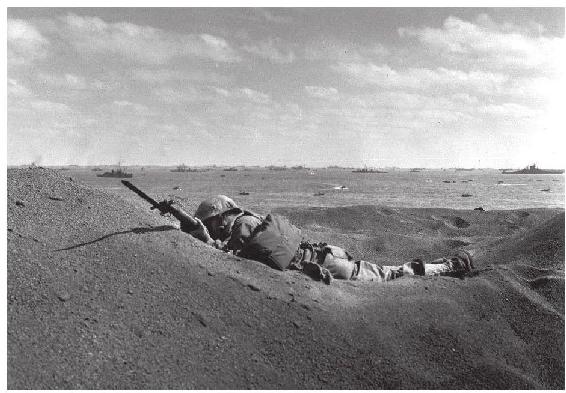 一名被日军射杀的陆战队士兵。他躺在火山灰沙滩上,手中还握着枪,不远处的海面上到处都是支援和登陆的舰船