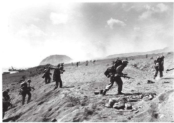 前进中的陆战四师。眼看着战友倒在沙滩上,但已无人能够顾及。图中能清晰地看到折钵山,也就意味着山上的日军要实施俯射并击中目标,是件易如反掌的事