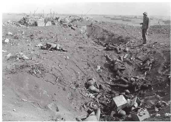 陆战队用炸药包炸开的一座碉堡。日本兵尸体横陈的景象,显然让站在沙坑旁的这名军人感到了惊悚和害怕