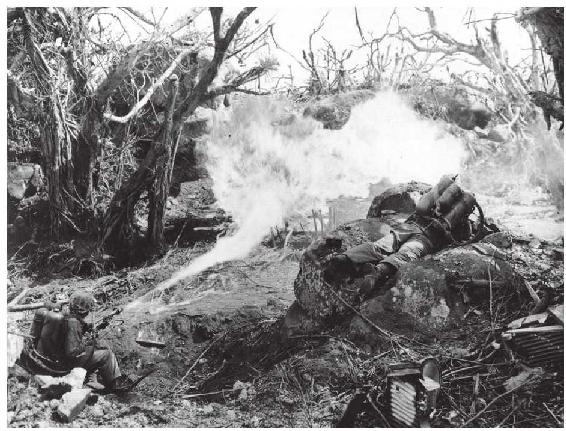两名陆战队员将火焰喷射器对准阻碍他们前进的日军防御工事。因目标过于显眼,火焰喷射手往往会成为敌方狙击手的活靶,同时他们也很少成为战俘,作为报复,被俘虏的火焰喷射手通常会被就地枪决