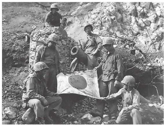 陆战队员在展示缴获的日军旗帜。日军把他们的旗帜看得很重要,旗帜被缴获,往往是一个成建制日军单位已被歼灭的证明
