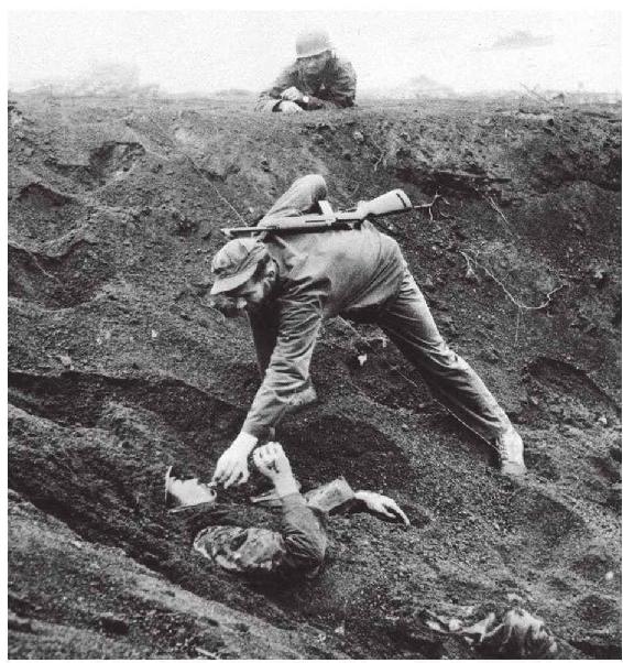 要在战场上俘获一名日军士兵并不容易,一般都是在日本兵受伤或失去知觉的情况下才有可能。照片中,因为害怕日本兵会拉手雷自爆,陆战队员小心翼翼地给了他一根烟,以示优待俘虏
