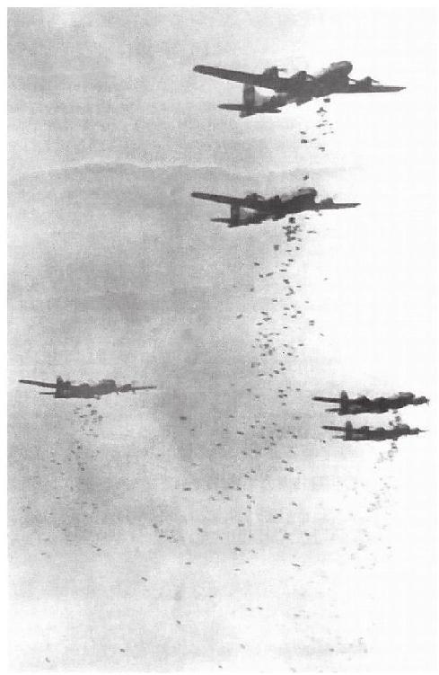 紧随其后的是飞行队主力,三架一组,对准“X”进行轰炸。B-29装有定时器,能够保证飞机每隔50英尺便投下500磅汽油弹,这样的话,每架B-29的载弹量都可以覆盖宽350英尺、长2000英尺的地带。