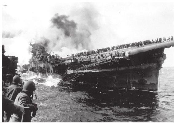 护航的“圣达菲”号巡洋舰正贴近“富兰克林”号,向其提供援助。图中可以看到“富兰克林”号已发生严重倾斜,甲板上的人们一边疯狂灭火,一边尽力采取措施进行修补