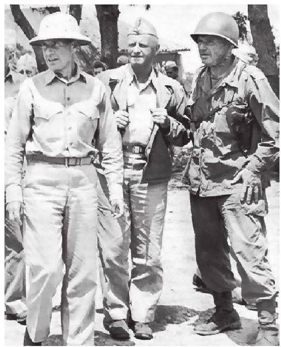 尼米兹视察冲绳岛。从左至右分别为斯普鲁恩斯、尼米兹和巴克纳