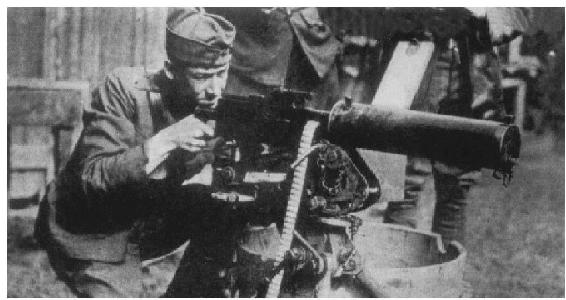 勃朗宁M1917A1重机枪。美国海军陆战队在太平洋战场上以步兵战斗为主,与日军坦克部队交手的机会很少,所以他们不像陆军那样装备有反坦克炮,最大的撒手锏就是重机枪。勃朗宁重机枪属水冷式重机枪,水冷套筒下方装有蒸汽软管,以免发热产生的水汽暴露机枪阵地位置。这种重机枪的持续射击能力很强,容弹量250发,陆战队每个营都装备有12挺勃朗宁重机枪,可有效实施交替射击