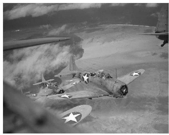 SBD“无畏”式俯冲轰炸机。与“破坏者”鱼雷机、“野猫”战斗机并称为太平洋战争初期美国的三大主力舰载机型。与“破坏者”不同,“无畏”的良好性能得到了飞行员的极高评价。但是它的装甲较为薄弱,最怕碰到日军的“零”式战斗机