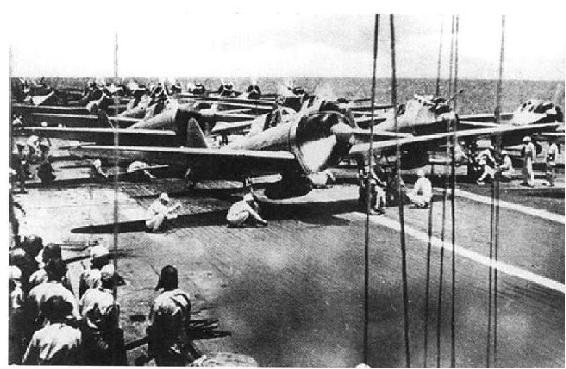 在飞行甲板上做起飞准备的日机攻击队。日军合格的飞机和飞行员数量本来就有限,可是作战时却有一股“偷得爷钱没处使”的慷慨劲儿,结果就是越打越少,直至变成穷光蛋一个