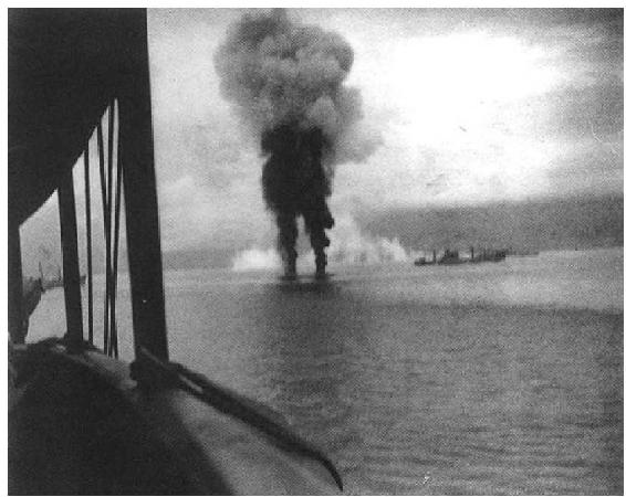 瓜岛海域的盟军运输船队遭到空袭时的情景。水面上的烟柱并非飞机炸弹所造成,而是被击落的日军飞机,可见日军虽然也试图切断对方的补给线,但收效甚微