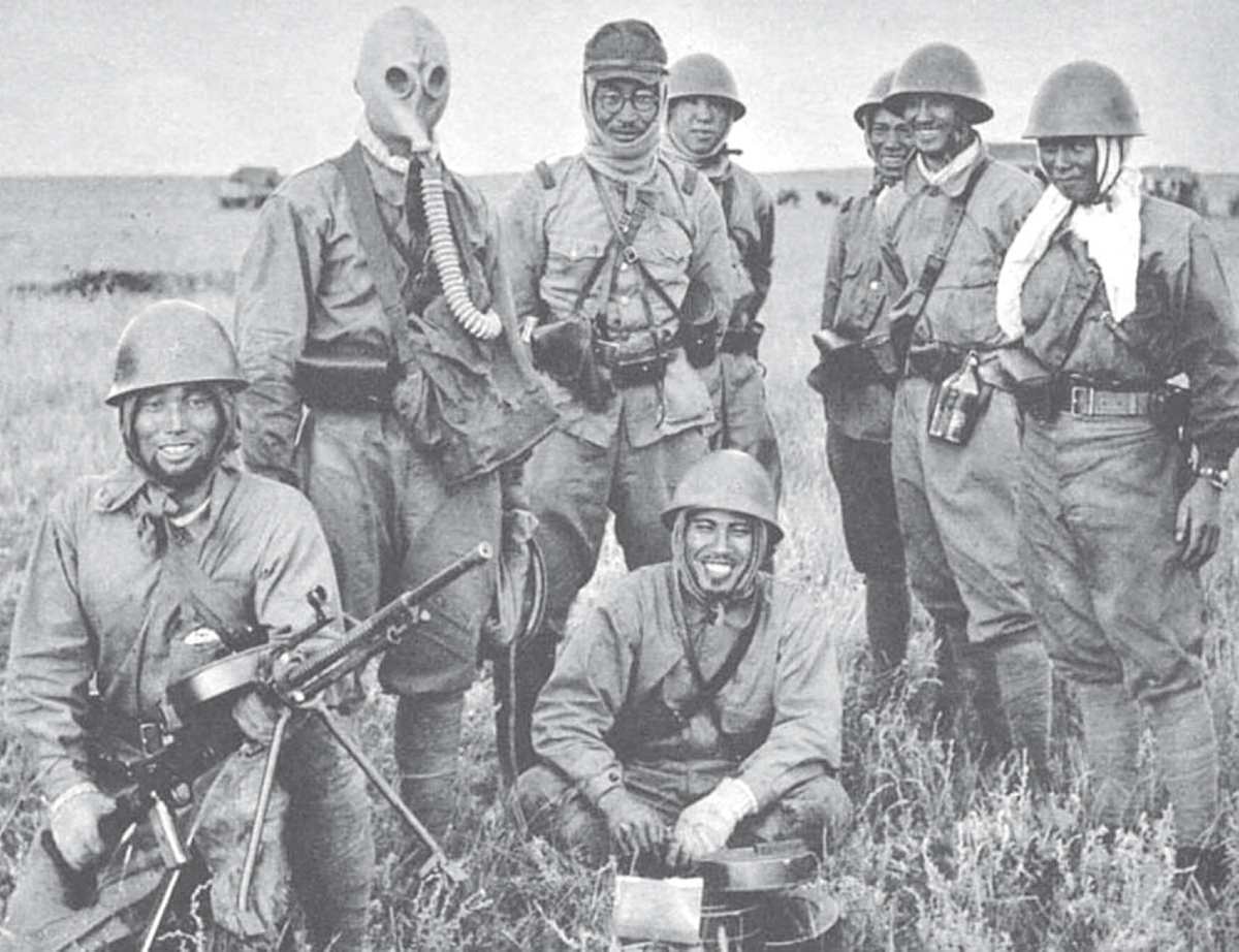 日军士兵在展示和炫耀从苏军手中缴获的战利品。左二士兵头戴的防毒面具应该也在其列,由此反过来可以说明苏军在反毒气战和细菌战上确实早有准备。