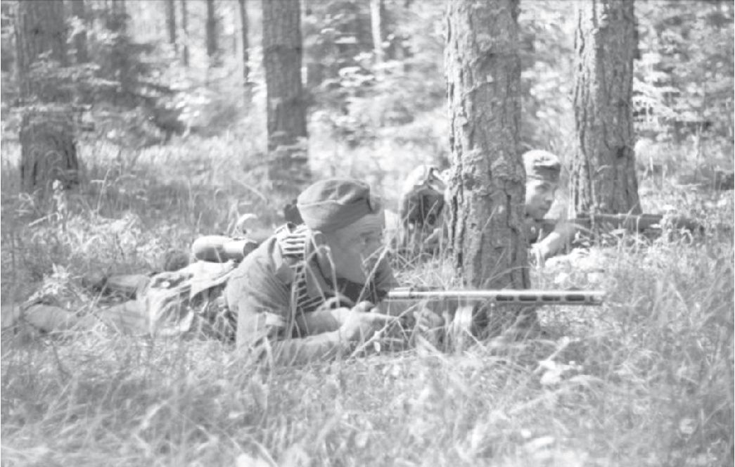 图中苏联士兵所持武器即为“波波沙”冲锋枪。“波波沙”冲锋枪在近距离内有着无可比拟的火力优势,非常适于实施“火制”战术。