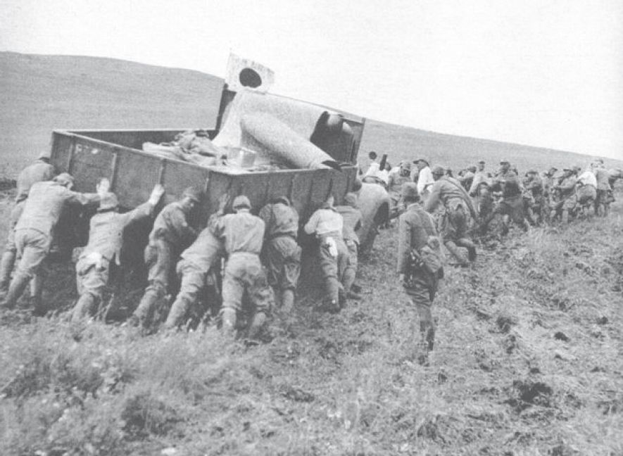 一辆汽车陷在了沼泽里,于是士兵们全都成了累死不偿命的牲口。日军相对落后的后勤运输和补给能力是其难以克服的短板。