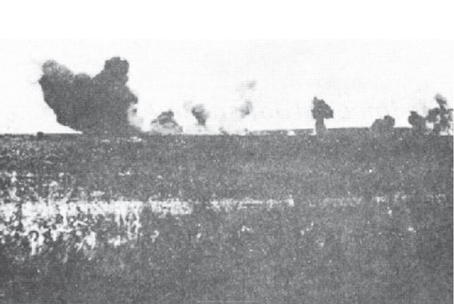 突然,部队最前方冒起一股黑色硝烟,跟着轰的一声巨响,弹片四处飞溅,漫天飞舞,在拂晓和晨雾中显得格外耀眼。这是西岸外蒙古高台上的苏军重炮阵地开始发言了,以第一声炮响为开端,炮弹铺天盖地般的射过来,就好像是成千上万个空罐头被一齐敲响了一样,声音震耳欲聋,惊天动地。