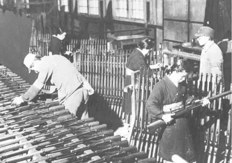 正在检验步枪的日本女工。太平洋战争中后期,尽管日本动员了其国内的全部资源,但力不从心之状也已显露无遗。