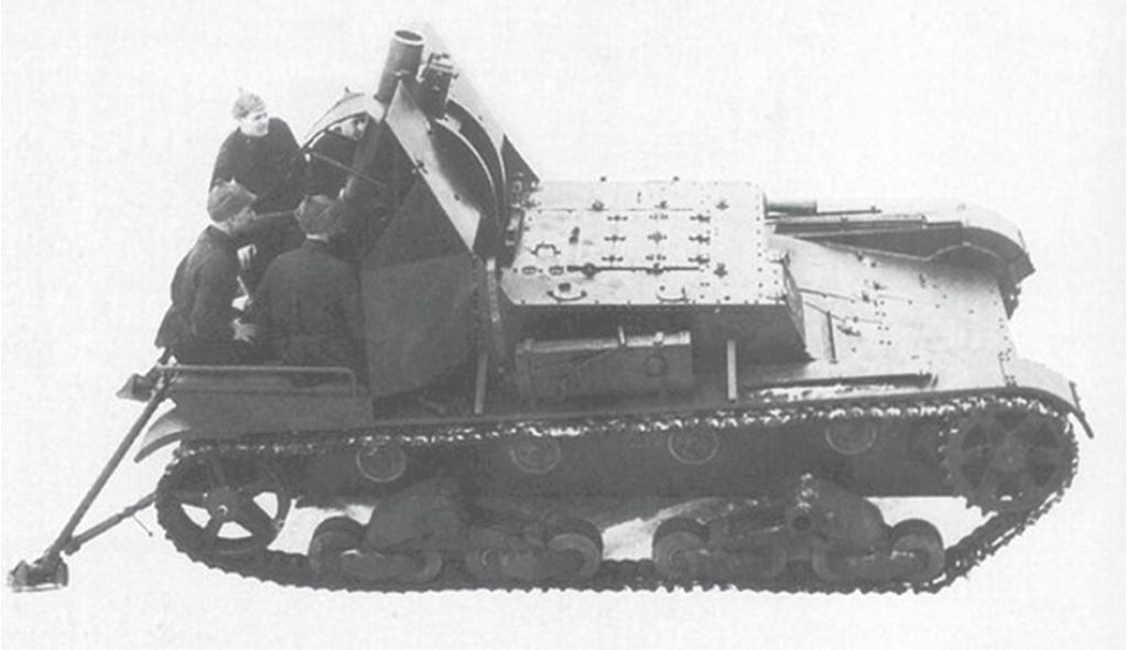 苏军SU-5自行火炮。自行火炮使用车辆底盘自备动力,无须其他车辆牵引,且有轻装甲保护。图中的SU-5自行火炮搭载了152.4毫米榴弹炮,火力极强。