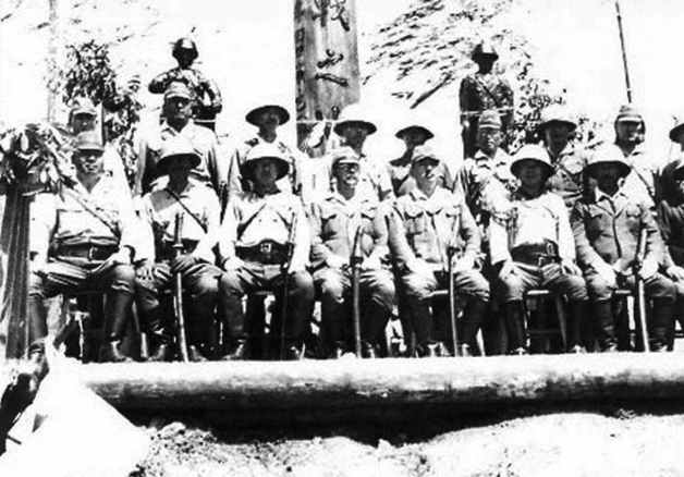 第18师团从新加坡开赴缅甸时上层指挥官的合影,第一排从左到右为第56步兵联队联队长藤村大佐,第55步兵联队联队长木庭大佐,第23旅团旅团长垞美少将,第18师团师团长牟田口廉也中将,第18师团参谋长武田大佐,第18炮兵联队联队长高须大佐,后排为工兵、骑兵、辎重各联队指挥官。