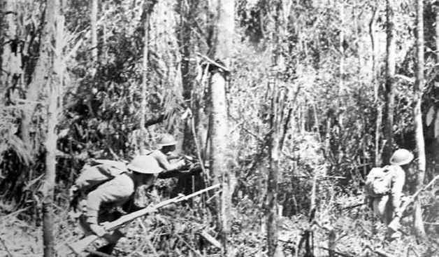 远征军的战士在丛林中摸索前进,搜索日军狙击兵。