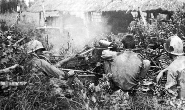 远征军战士在丛林中与日军交战,敌军就在100米内,从火力上来说,缅甸战场上中国军队对日军有压倒的优势。