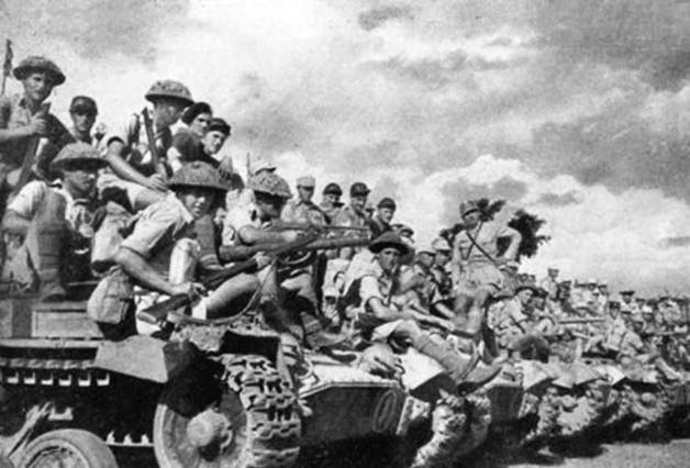 远征军的战车上搭载着头戴英国式钢盔的中国步兵,与各国的政要们相比,他们才是对反攻最为热切的支持者。