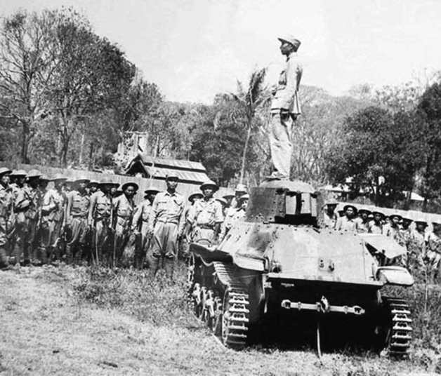 潘裕昆将军站在缴获的日军战车上讲话