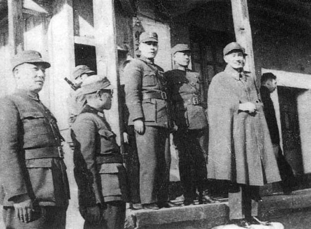 蒋介石视察驻印军新一军军部。台阶上右为蒋介石,中为郑洞国,左为军参谋长舒适存。
