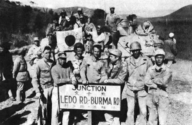 装甲部队人员在中印公路与滇缅公路打通的路标处合影