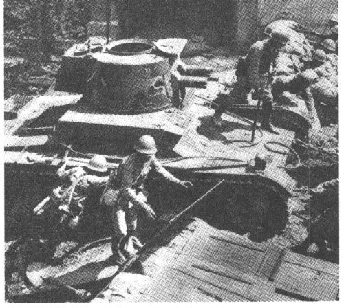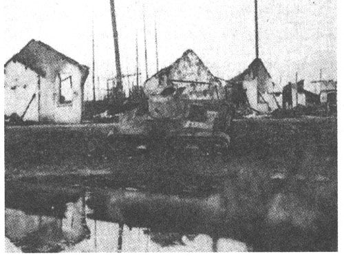 淞沪抗战爆发后,中国军队猛攻日军在上海的据点,战车部队多次参战。最初,因为战车采取分散行动,每辆协助步兵攻打一个路口的方法,缺乏彼此的掩护,遭到较大损失。攻击汇山码头时中国军队将三辆战车编成品字队形,突击效果很好。但是,由于日军重武器占有绝对优势,虽然中国军队攻入汇山码头,还是无法立足,三辆战车两伤一毁。下面照片就是激战后被毁的那辆战车,也是三辆车中坚持到最后的首车。由于它顽强抵抗,战术动作机动灵活,日军集中炮火对其轰击才将它击毁,周围房屋也都被炮毁。
