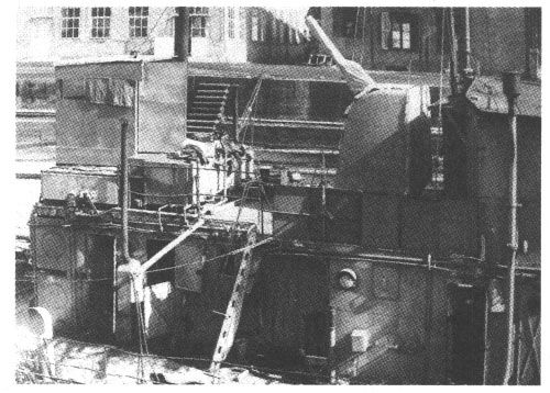 这张照片,是在江南造船厂进行修理的势多号炮舰局部。该舰在长江中被中国水雷炸成两截而沉没,后段搁浅于岸边,打捞后重建一个新的舰首后修复,得以继续使用。战后赔偿给中国,成为中国海军常德号炮舰。