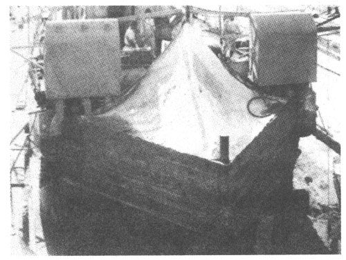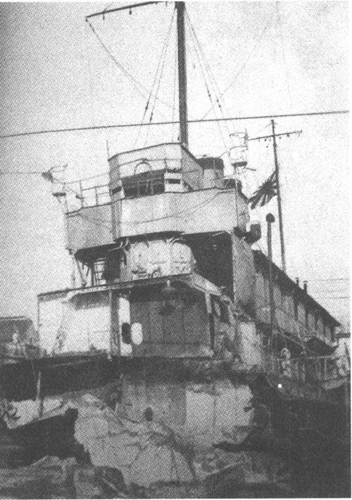 一张别致的照片。起浮后的势多号后段由于需要沿江行到船厂,为了避免进一步进水,前部装了个临时的舰首。舰首两侧的铁皮方形物品是什么?平田说是给工程人员用的厕所。