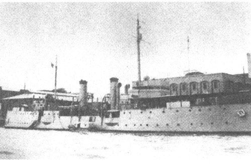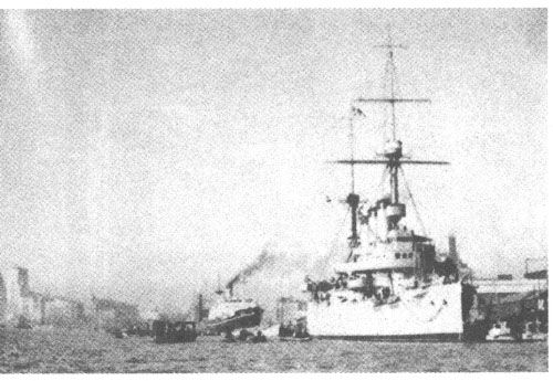 日本海军侵华舰队的旗舰出云号装甲巡洋舰,停泊在黄浦江上,标准排水量9750吨,长121.92米,宽20.93米,吃水7.37米,主机功率14500马力,航速20.75节,编制672人。装备203毫米炮4门,150毫米炮14门,12磅速射炮12门,2.5磅速射炮8门,450毫米鱼雷发射管4具。