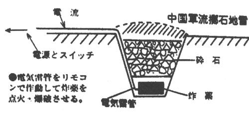 第一张图“中国军流掷石地雷”。这就是《地雷战》中提到的石雷,又名“天女散花”,本来是地方游击队因为缺少钢铁,难以制造正规地雷的代用品。没想到用起来后发现,这种地雷日军无法探测(没有金属),而且碎石在炸药爆炸后杀伤很大,于是风靡一时。