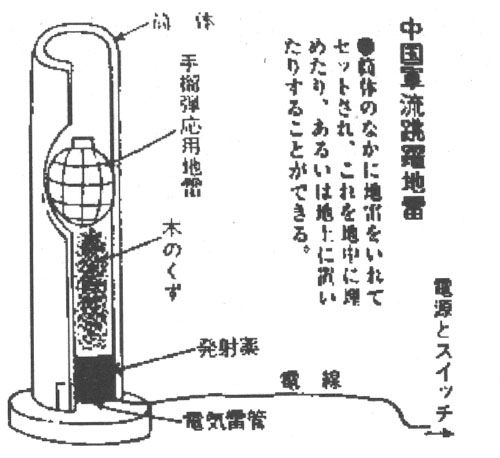 第二张图“中国军流跳跃地雷”。这就是所谓的跳雷。实际上是一个竹筒或者木桶,底部安装炸药,顶部放一颗手榴弹,中间用锯末填充,引爆炸药后就会将手榴弹弹出地面,在半空击发,使日军连卧倒都找不到死角。